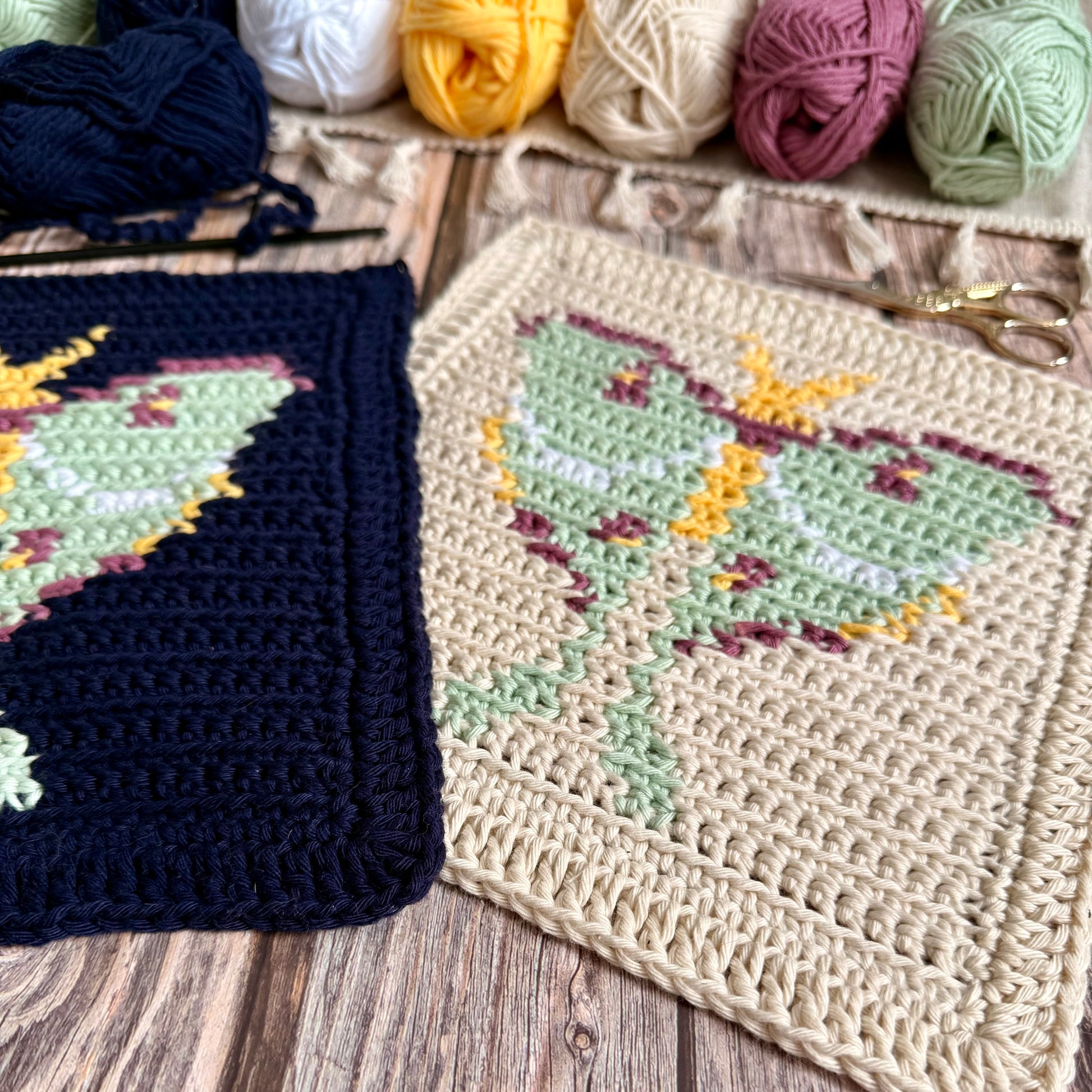The design is worked in modified single crochet and finished with a tidy, textured border and an optional hanging loop for drying or display. The pattern includes two colour options—a deep navy and a soft off-white background—but you can customise it to suit your own space or yarn stash.