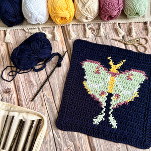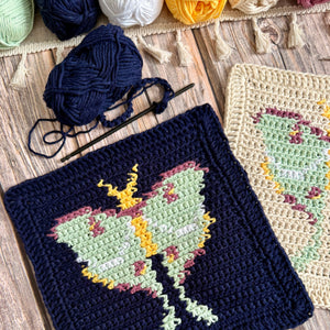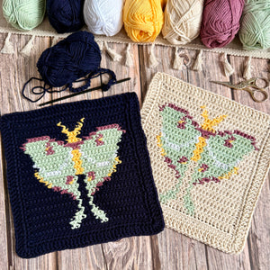 Add a touch of night-time charm to your kitchen or bathroom with Among Moths and Moonlight – a bold crochet washcloth or dishcloth featuring a single elegant Luna moth motif. Known for their soft green wings and quiet, twilight flight, Luna moths are named after Luna, the Roman goddess of the moon. Long associated with calm, reflection, and nature’s gentle rhythms, these graceful creatures bring a peaceful, celestial feel to your handmade makes.