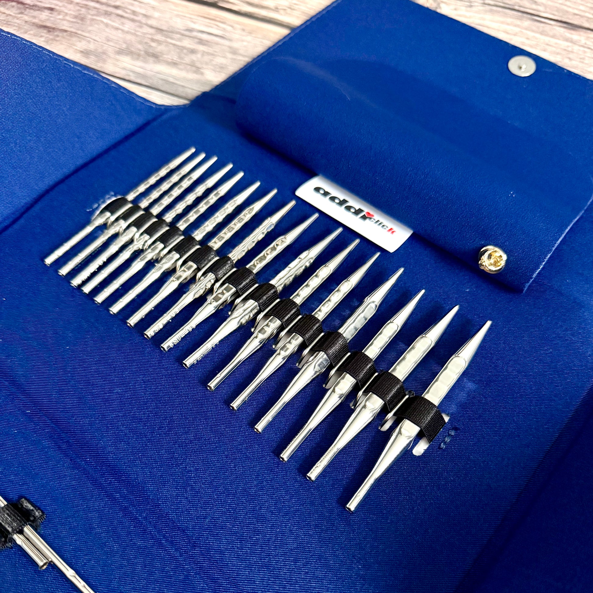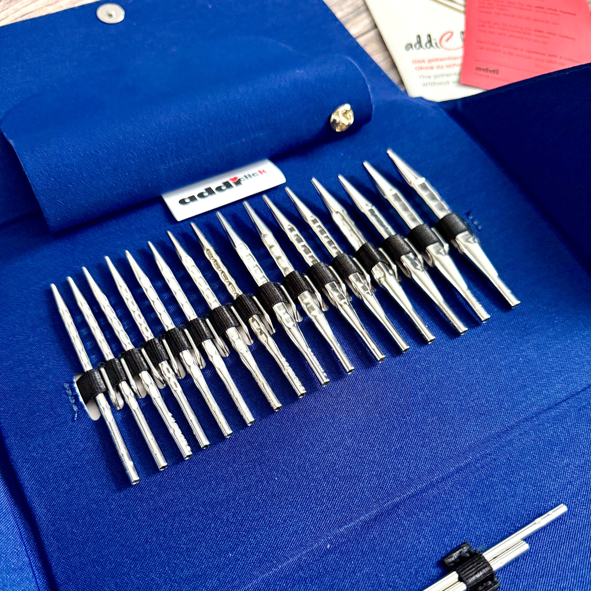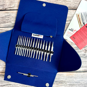 The addiClick Novel Short Lace Interchangeable Knitting Needle Set features Addi’s ergonomic square lace tips in a shorter 9cm length.