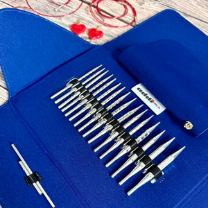 This Short Lace version includes five red lace cords, allowing circular needle lengths from 40cm to 100cm. Supplied in a blue textile case.