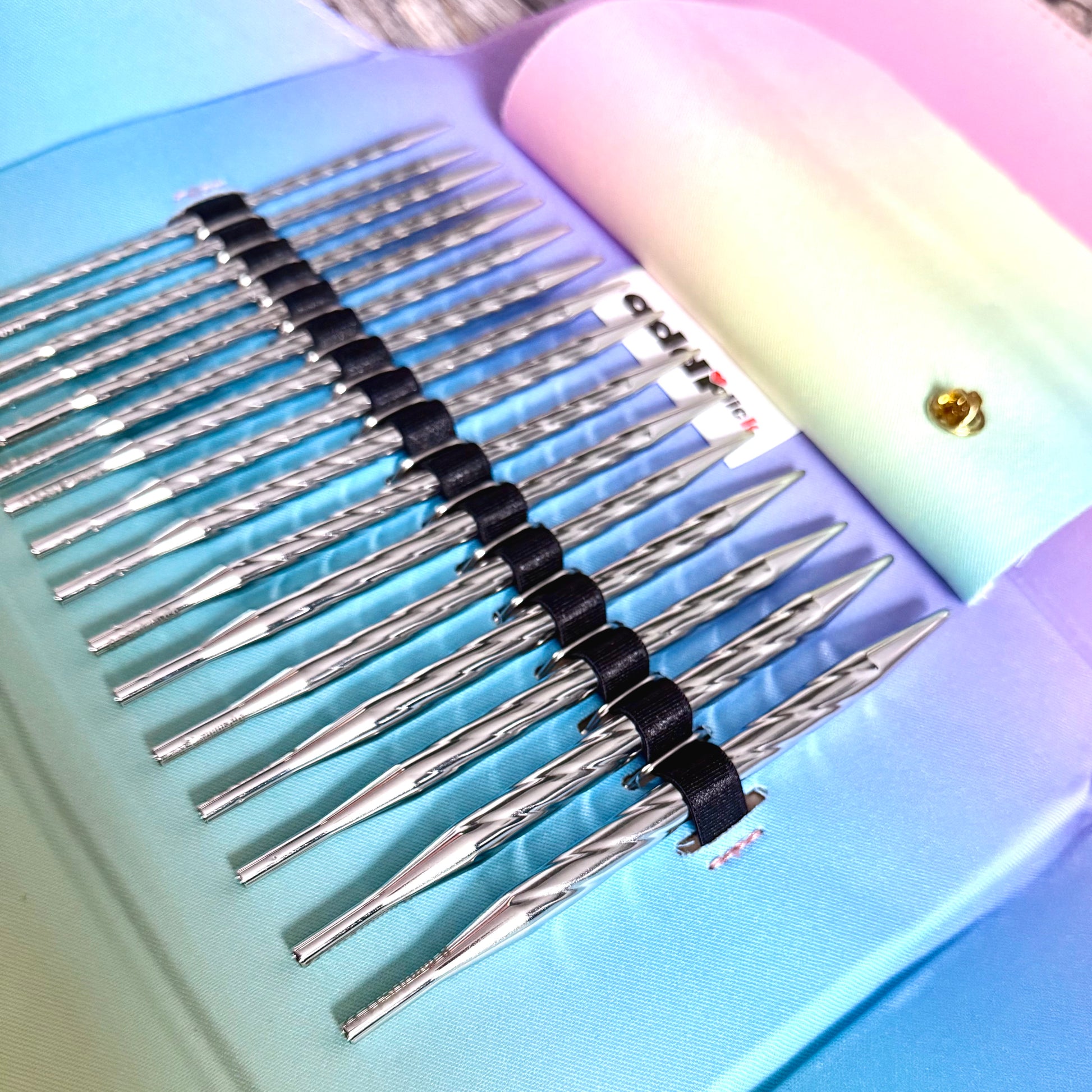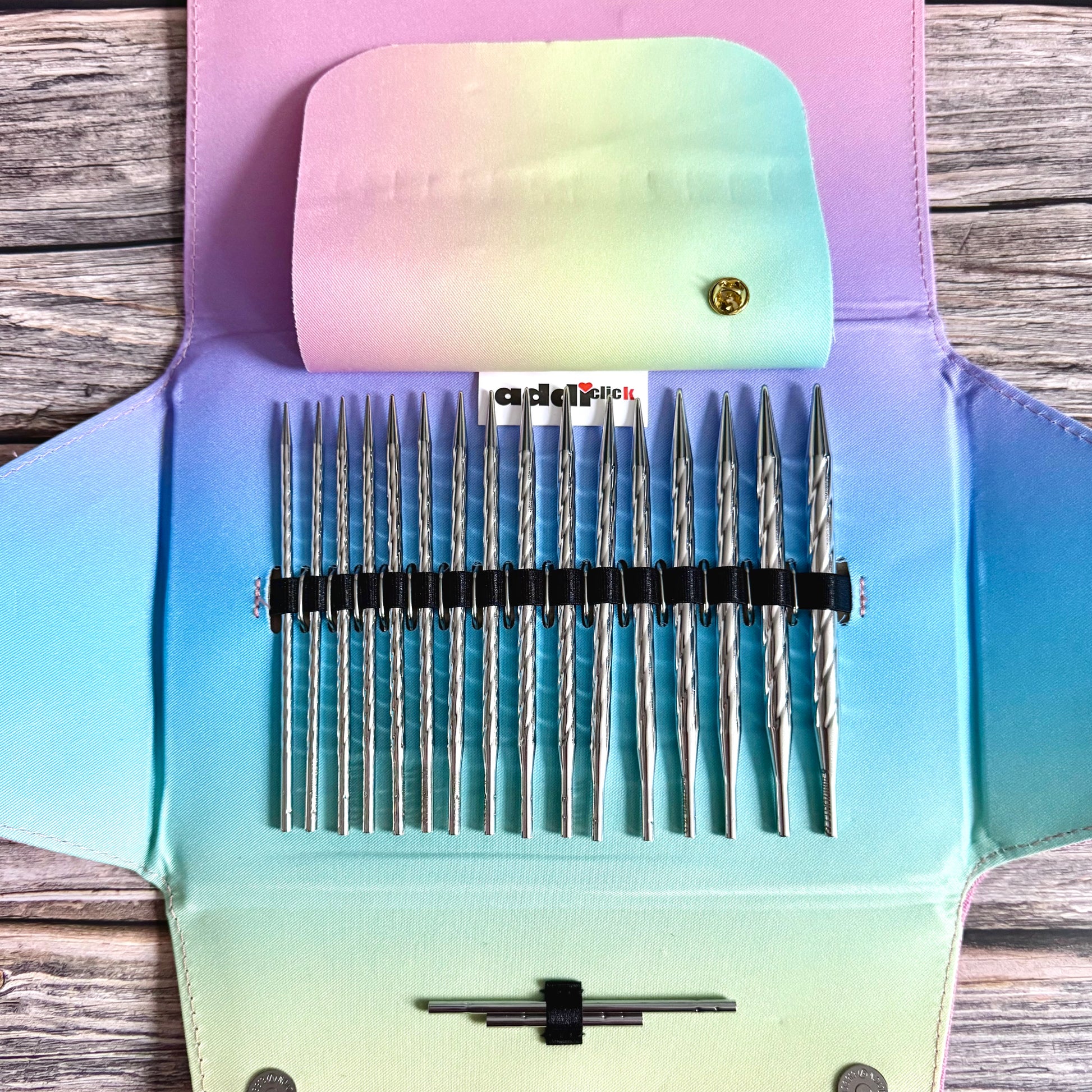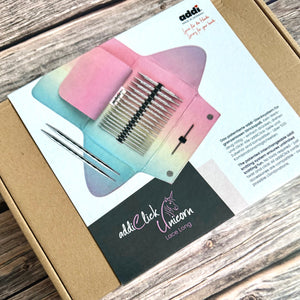 The Addi Click Unicorn Long Lace Interchangeable Knitting Needle Set is a premium interchangeable knitting needle set featuring 12.5cm spiral white bronze tips and addi’s secure click connection system. Supplied in a candy pink textile case with pastel rainbow lining, this set combines precision engineering with signature Unicorn design.