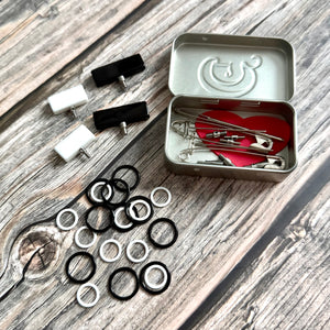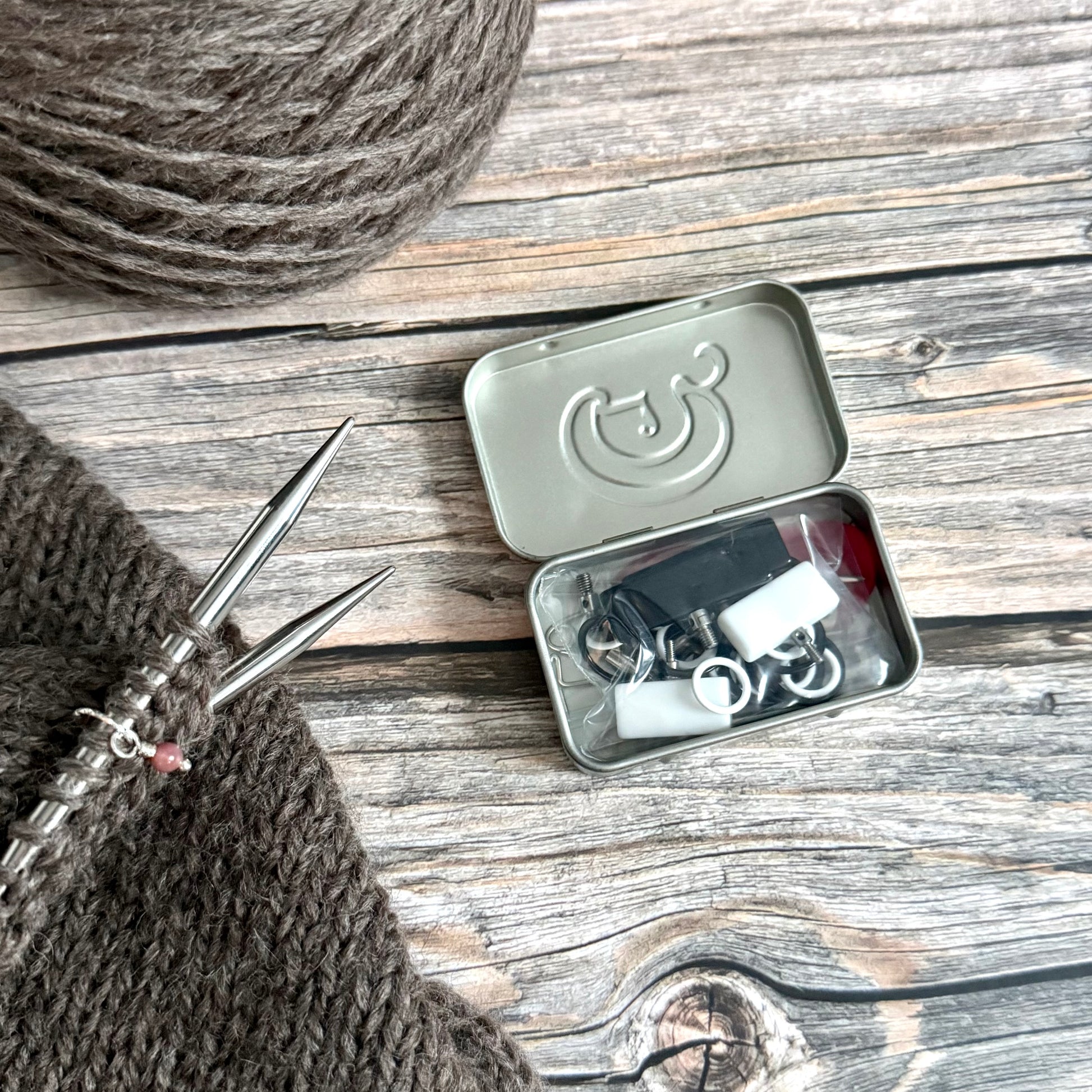 Small Cable Connectors × 2 Large Cable Connectors × 2 Small End Stoppers × 2 Large End Stoppers × 2 Large Tip to Small Cable Adapters × 2 Darning Needles × 2 Stitch Markers × 20 Safety Pins × 2 Heart-Shaped Rubber Gripper × 1