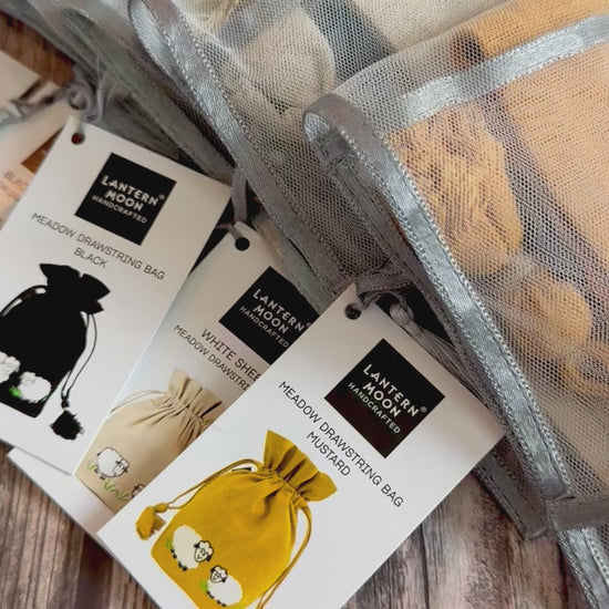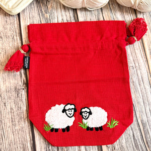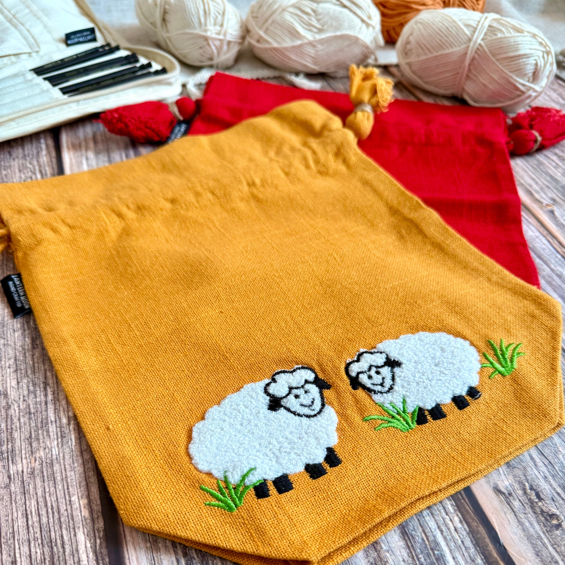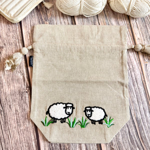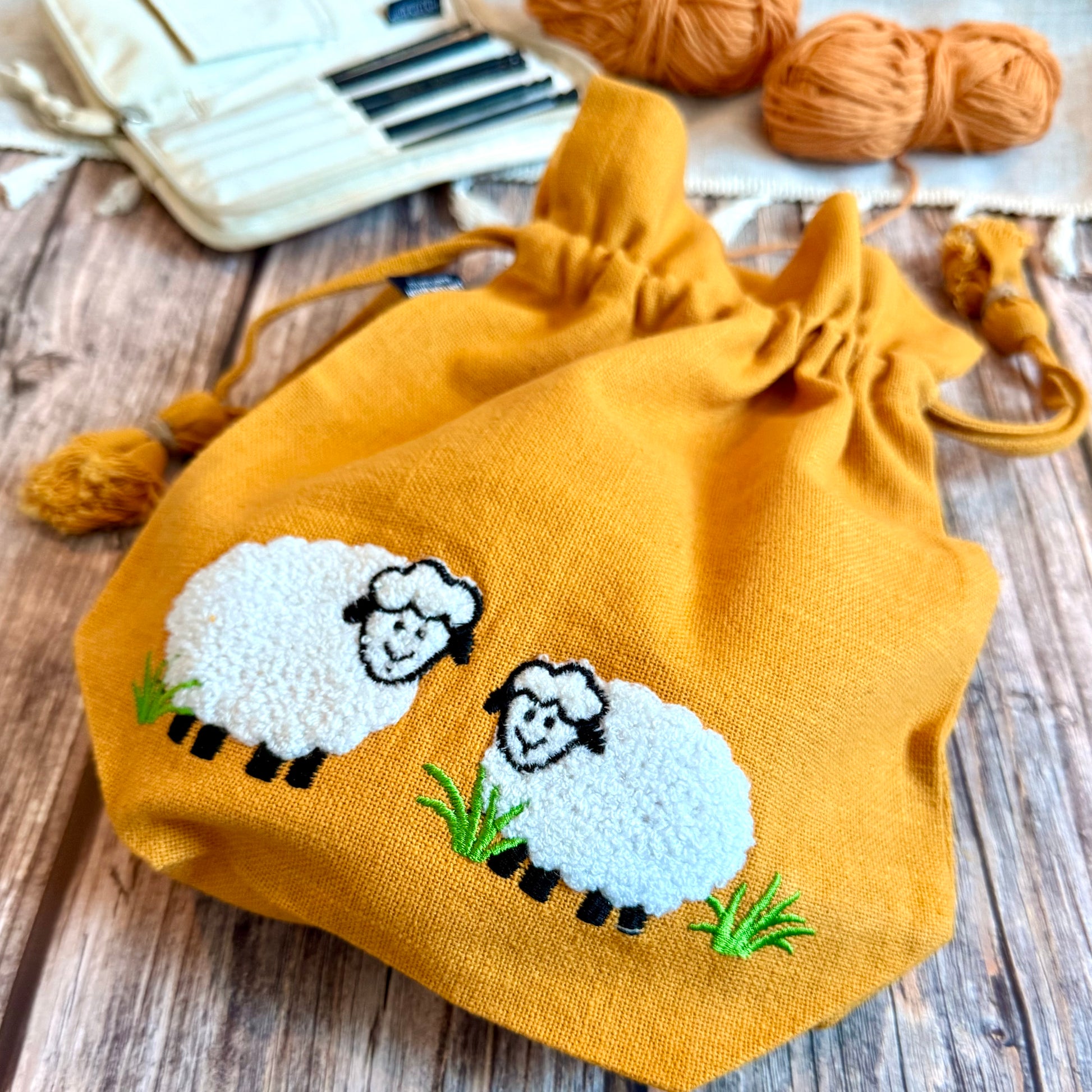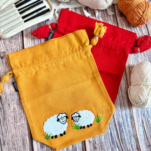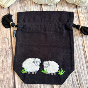 Each bag is finished with sweet embroidered sheep and a simple drawstring closure to keep everything safely tucked away. The flat bottom design means your bag will sit upright beside you while you work.